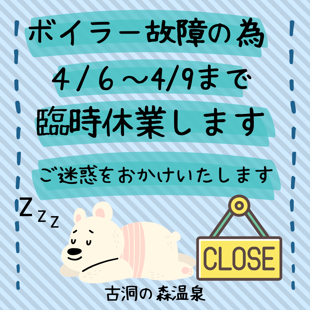 この度、ボイラー故障の為下記の日程で臨時休業することになりましたので